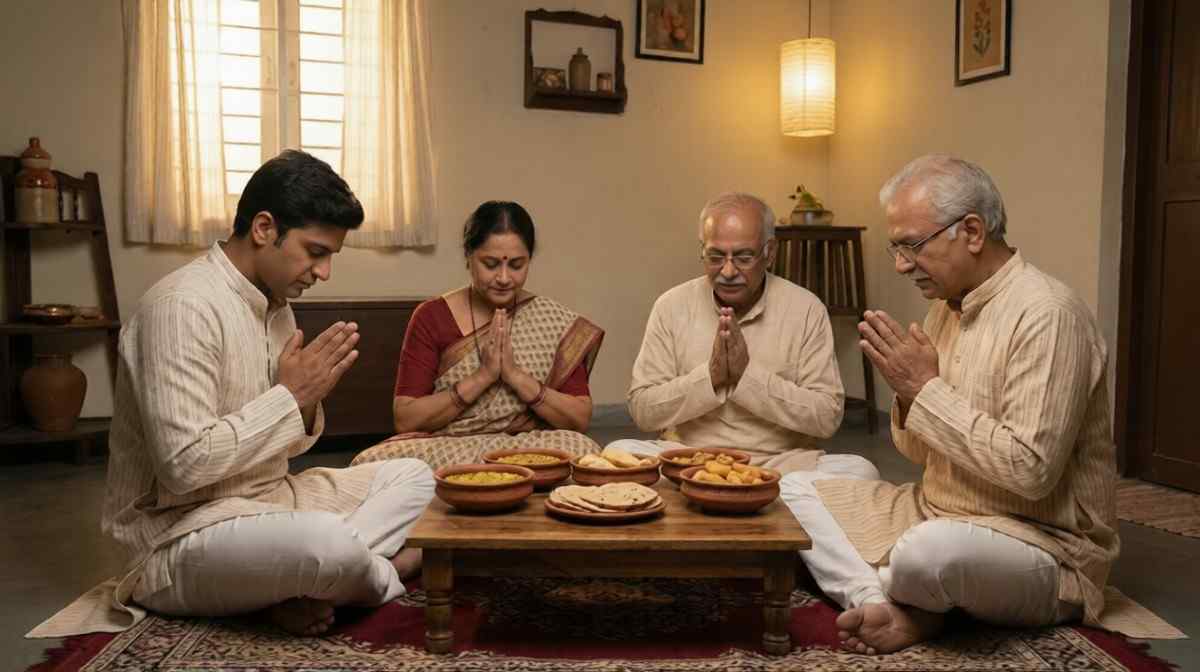 Indian family practicing gratitude before eating traditional food