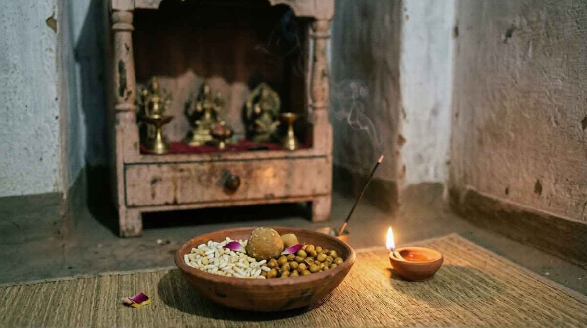raditional Indian food offering before prayer at home